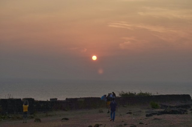 We immediately changed and then headed for Chapora fort, the location of Dil Chahta Hai shooting. We had the rub of the green and reached there by 6-6.15 PM, before the sunset. With a little bit of short trekking, we reached the top of Chapora fort. The drowning sun was taking its last few breaths; entire sky had taken the shape of a colorful canvas bathed primarily in an orange hue with a seldom sight of white, blue and grey clouds here and there. The pristine water of Vagator beach and a very tranquil, uncrowded ambience was cherry on the top.