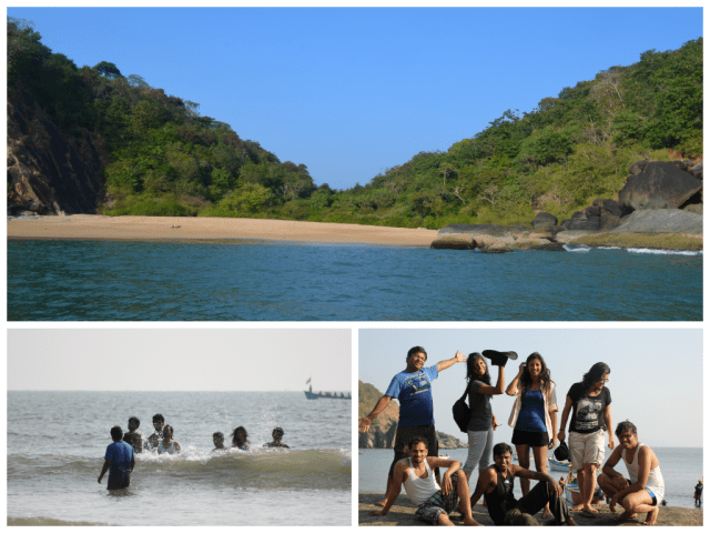 We all woke up at around 9-9.30 AM and left for south Goa by 11 AM. Me, Komal, Anshu, Sneh, Hitesh & Mukki were on bikes and Mohit, Subodh, Himani, Neelu and Nalin were in car. It was a very beautiful 3 hour ride to Palolem beach in south Goa, especially the last 25 km. We witnessed all types of roads right from smooth highways to crowded cities, from coconut and palm groves to hilly regions with sharp hair pin bends. Palolem is totally different from Calangute beach. The sand here is white and much finer. It is relatively very less crowded and water here is a bit still. We hired a boat for ride and went to honeymoon beach from there. It was really scary to ride in ocean without life jackets and all. The boat often used to go topsy-turvy owing to strong waves and scared the shit out of me. On our return journey from there, we managed to see some dolphins as well. It was 5.30 PM by the time we were done with Palolem beach. Since, we had to drive back and roads were a bit dangerous, so we planned to leave immediately and left by 6 PM. My heart was longing for more but my body was sort of giving up. After driving for 6 hours, it was great relief to reach resort and properly stretch my legs and hands and lie on bed with straight back.