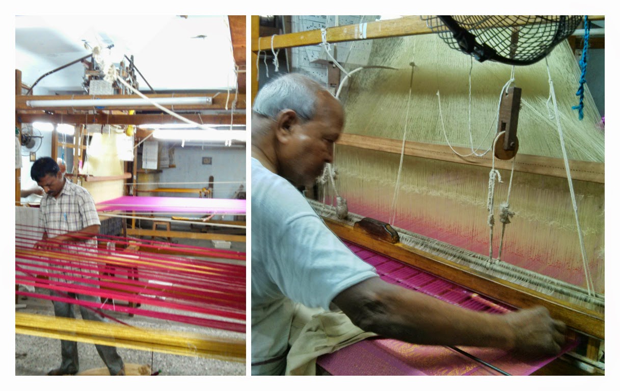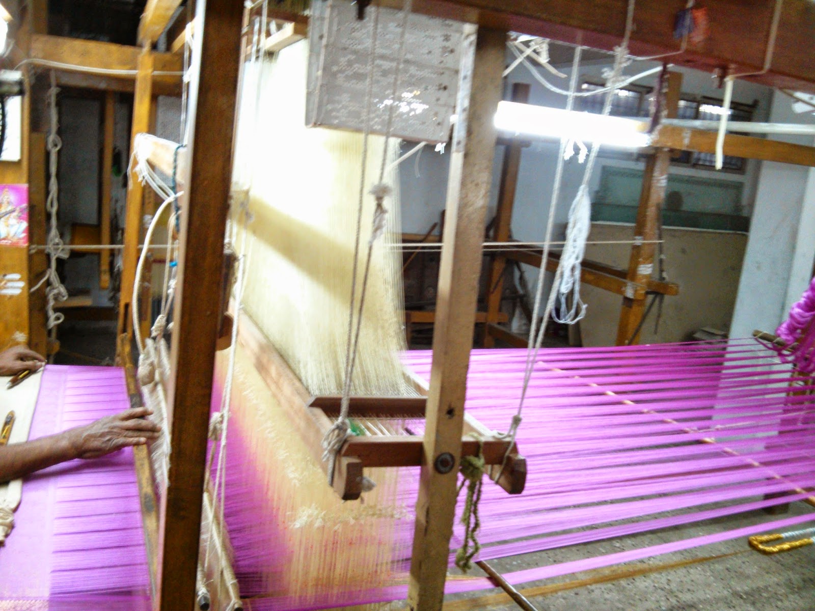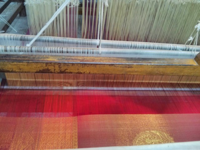 Kanchipuram is world famous for its kanjivaram silk sarees, and is “the” destination for silk aficionados. A Kanchipuram/kanjivaram saree is hand woven by the weavers and has distinct shimmer. Owing to this, Kanchipuram is also called “Silken paradise”. We did a bit of shopping from some local factory outlets which sell sarees at comparatively lower rates from markets. However, I must mention, the sarees from even the factory outlet are not dirt-cheap, the cost of hand weaving the sarees is substantial; the sarees I bought cost me around 4000/- each. I had the curiosity of visiting the silk factory and see how it is prepared. So I requested the owner of the place where we bought the sarees from, to show me the manufacturing unit. When I saw their so-called factory, I was surprised – a small room with 3 weavers working meticulously on their weaving machines, that’s it. The type of saree which one of the guy was working on would take around 15-20 days to complete if he were to work for almost 8 hours a day. This small bunch of people nestled in small claustrophobic room and similar settlements spread across the city is the production house of the sarees which grace the body Indian females and exalts their sartorial elegance to newer heights.