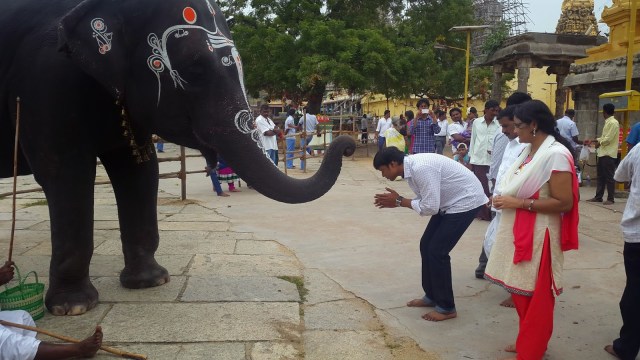 | In the backyard of Kamakshi Amman Temple, taking blessing from an elephant |