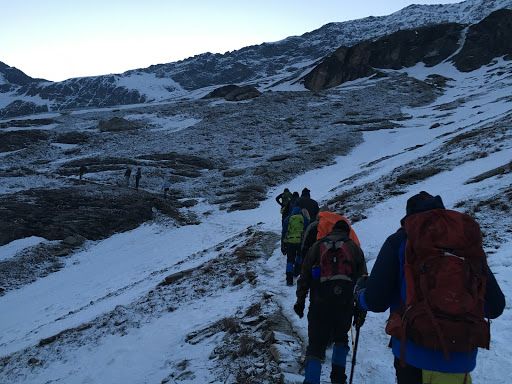 We had to start before the daybreak. This is because snow is hard in the wee hours of the morning and it’s easier to walk on it. Snow starts getting softer as the sun rises and poses problem. Hence, we were supposed to wake up at 2.30 AM in the morning and leave the camp site at 3.30 AM sharp. When I woke up at 2 AM to get done with my morning chores, to my horror, I noticed that there weren’t any toilet tents. Last night’s wind had shown its colors and all the 3 toilet tents were down. I immediately rushed to IndiaHikes staffs and apprised them of the situation. They were prompt and within 15-20 minutes erected the tents for us. Quite an eventful start to the D-day.