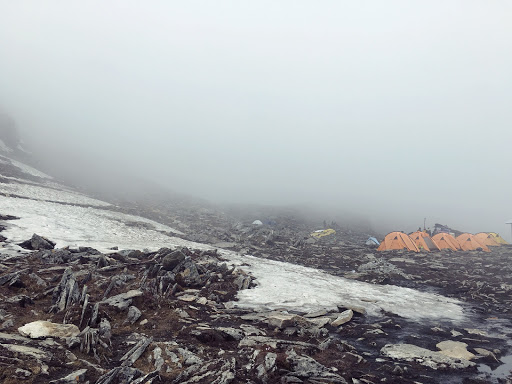 We kick started our descent to Bhagwabasa camp site after half an hour. This trail was our first encounter with snow line. This camp site was entirely rocky with snow patches here and there and no trace of grass. Draped in a dense mist, Bhagwabasa camp site provided a magnificent view of Trishul and Nanda Ghunti. And it was from here that we first got the glimpse of our summit point, Roopkund lake. Far away in the snow-capped mountains, cradled amidst the majestic peaks was a small depression. A frail zig-zag path soaring over snow leading to the depression. It was beyond that depression lied Roopkund, a mystery resting peacefully in the cusp of mountain.