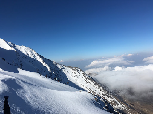We rested in between for a while, before climbing the final stretch. I ate the apple that was given at the camp site. I looked around. Dawn had broken over me. Acres of whiteness draped in blue hue with a tinge of tangerine at the horizon. Was it real? Or was it Picasso’s canvas or some scene from an eerie horror movie? It was a magical realism.