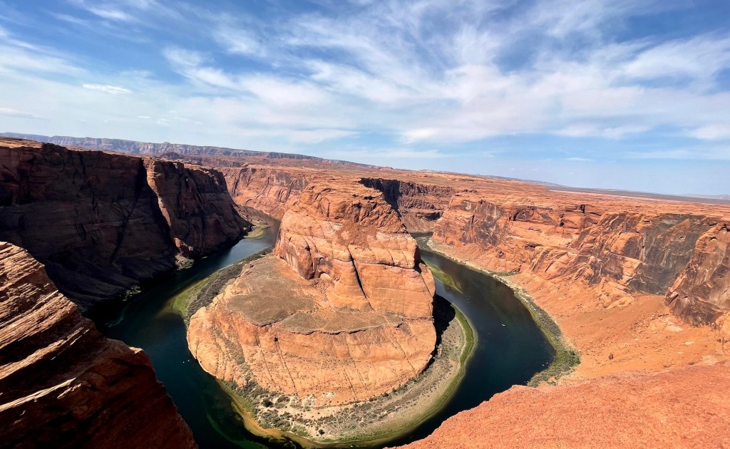 At noon, we reached Horseshoe bend. Horseshoe Bend is a horseshoe-shaped incised meander of the Colorado River located near the town of Page, Arizona. It is also referred to as the ‘east rim of the Grand Canyon’. Colorado river takes a 270° turn as it encounters harder rock formations that were relatively harder to cut. Horseshoe Bend is just a small diversion off US Highway 89. The hike to the overlook is 1.5 miles (2.4 km) round-trip over a hardened path. It was really hot there – blazing sun without an inch of shade. We packed a bag with a water bottle and walked up to the overlook where we were greeted with a view of Colorado river incising into Glen Canyon culminating into a horseshoe shaped formation, called eponymous Horseshoe Bend.