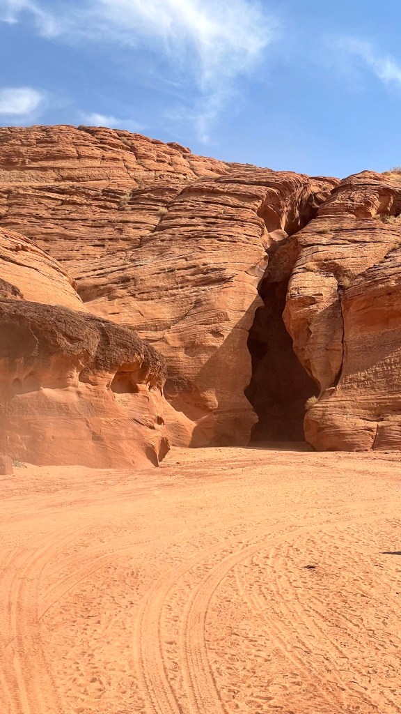 At sharp 1:55 PM, we boarded a shuttle that took us on bumpy and dusty 20-minutes’ ride to the entrance of Upper Antelope Canyon. The initial stretch of the road was well-paved but soon enough we hit the desert. And when you are in a desert, you can be sure of 1 thing – sand and wind. No wonder, the desert embraced us and left its stamp on our body and belongings. After that bumpy, windy, and sandy ride, we saw a swirly crack in a distant cliff. With other shuttles parked there, it was easy to identify that we had reached our destination.