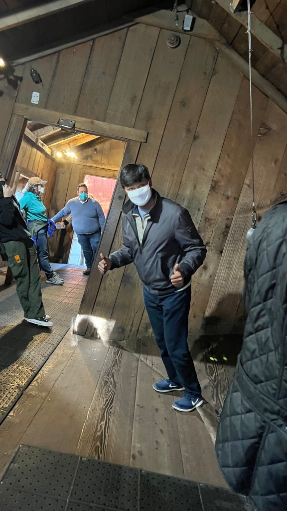 This was a relatively quiet day. Our flight was at 5.30 PM in the evening. Jyothi wanted to see Golden Gate Bridge but driving to San Francisco and coming back to San Jose airport was going to be tight. Moreover, it was unpredictable given the weekday rush. So, we decided to keep it light and hang around San Jose only. We went to The Mystery Spot. It is a tourist spot which gives demonstrations that appear to defy gravity, like ball rolling up the incline, people leaning farther than normally possible without falling down and so on. To be honest, I was not able to figure out the science behind it at that time. It was only when I came back home and then did a mini experiment myself, I understood the science (or rather illusion) of The Mystery Spot. The crucial thing is that the house at The Mystery Spot is tilted by 20 degrees or so. Suppose you try to roll a ball on plane which is inclined at 15 degrees but in the direction opposite to that of the house, the net incline is still in the direction the house is tilted. So, when a ball is released on that plane, it rolls up the incline, that is towards the tilt of the house. Similarly, in the house it appears that a person can lean farther than normally possible. It is an optical illusion caused by the tilted house as people perceive height and tilt using the slant of the roof rather than the true horizon.