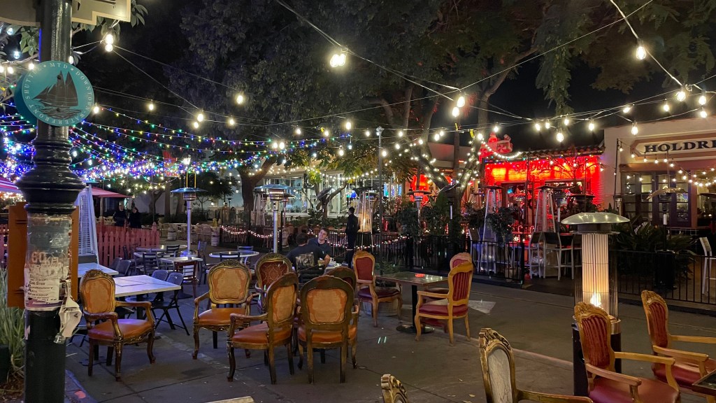 Now the day was almost wrapped up and it was getting dark. So, we headed towards Santa Maria via Santa Barbara. We stopped at Santa Barbara for 2 reasons. First, to drive on its pier. Yes, you can actually take your car and drive on its Pier Santa Barbara. Second, to have our dinner. Santa Barbara has better and a greater number of restaurants than Santa Maria. We had our dinner at a Nepali restaurant Himalayan Kitchen. Jyothi and I had non-veg thali, while Raj had chicken fried rice. The thali was so good and fulfilling that it necessitated a short walk after the dinner. We had roamed around Santa Barbara on Day 2 but most of the shops and restaurants were closed around noon. It was a completely different story on this day. All the Christmas lights had sprung to life with chairs and patio umbrellas of restaurants out on the street, smiling waiters standing outside with menus in their hands and people enjoying food and beer on the streets with flame heaters by their side to ward off the evening chill. Did I even visit this place before?