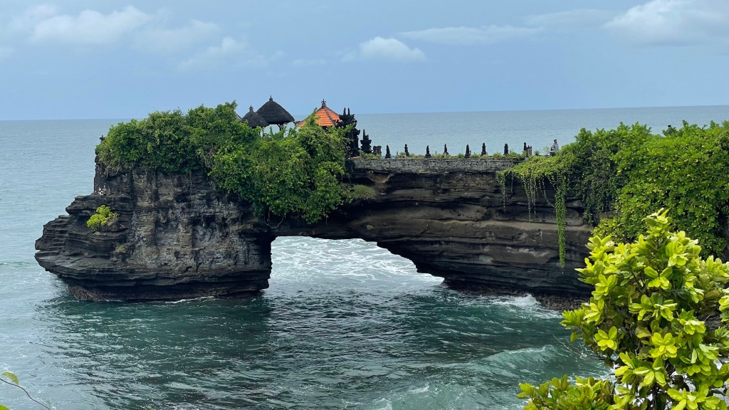North of Tanah Lot is Batu Bolong, built similarly on a rock formation with a hollow overpass linking to the mainland. Batu or watu means rock and bolong means perforated. There is a pathway from Tanah Lot to Batu Bolong lined with well-kept gardens.
