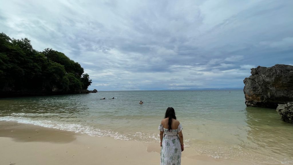 After Tanah Lot, we headed to Padang Padang beach. It was a long 2.5 hours’ drive from there. In between we wanted to go to GWK cultural park but we didn’t want to pay a hefty 150K per person ticket price just for an hour as we had planned Uluwatu Temple as well. So, we gave it a miss and headed to Padang Padang beach. The beach entrance is quite amusing. You have to go down a narrow stairway in between overarching rocks to access the beach. The shoreline of the beach is quite small but the view was quite nice. Morning rain was a distant dream; the sun was glowing in its full glory now. Many tourists were surfing and sunbathing here. We spent about an hour on the beach and headed to Uluwatu Temple.