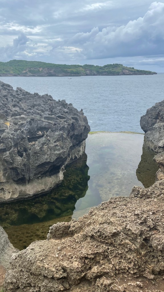 Our driver was right on time at 6 AM in the morning. OK, 1 thing to note – please request your hotel to arrange for a packed breakfast if you are leaving this early in the morning. This way you won’t lose your complimentary breakfast (in case you have paid for it). I didn’t know this. I asked at the last minute in the morning. Thankfully, Alamkulkul staff were generous enough to pack some bread, butter and croissants at such short notice. We headed east to Sanur from where we took a speed boat to Nusa Penida. Our tour included Klengking beach, broken beach, Angel’s Billabong and Crystal Bay. I was expecting a few more people on our tour, but to our surprise it was just 2 of us. So, it turned out to be a fully private tour for us. We took 8 AM boat from Sanur and reached Nusa Penida by 9 AM. Another car was arranged for us at the island to drive us around. It was another 1-hour drive to our 1st stop – Klengking beach. We drove past thick banana plantation and multiple coconut groves which gave south Goa vibe. Klengking beach is also called T-rex bay because the 150-meter-high cliff at the beach looks like the backbone of a dinosaur that would drink in the sea. After Klengking beach, we headed to Angel’s Billabong. It is a natural infinity pool that reveals itself during low tide and goes beneath the sea at high tide. The rocks around Angel’s Billabong are spiky due to erosion caused by constant splashing of sea water over thousands of years. There have been many accidents at Angels’ billabong so local people have created a small temple there to bless the local community as well as the tourists. Along the lines of all temples of Bali, outsiders are not allowed to enter that sanctum sanctorum. We drove further from Angel’s Billabong to Broken beach now. The highlight of this place is a horseshoe shaped cove formation in the midst of stunning blue and green waters. We took a small hike around the archway to immerse in the beauty of this place. It is not possible to go down the beach, just admire the amazing view from above.
