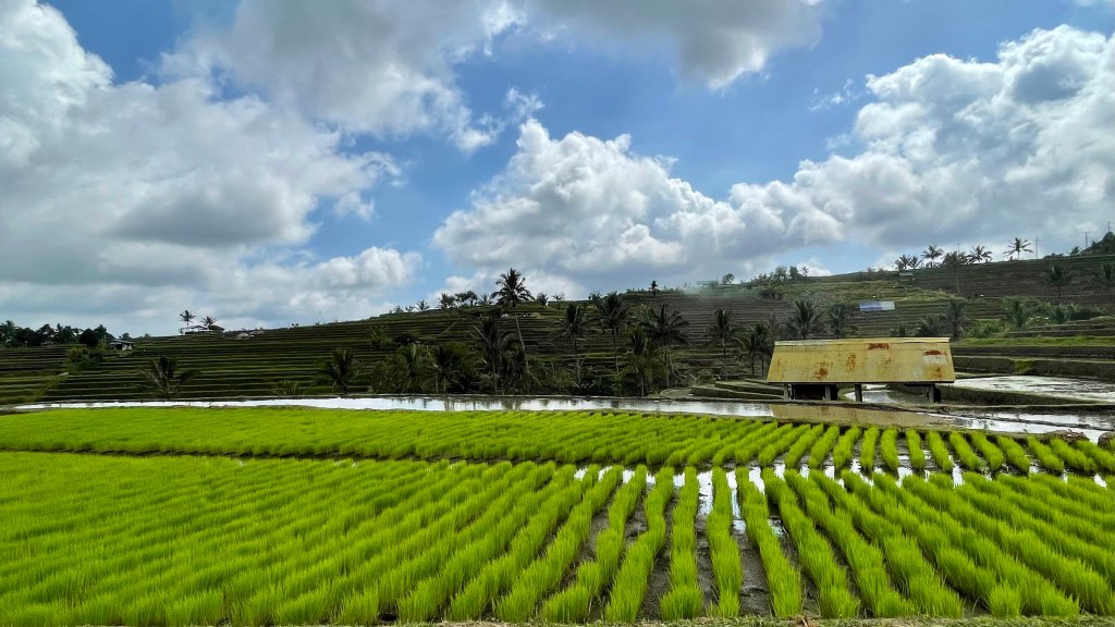 Anyway, after a not-so-good lunch, we headed towards Jatilwuh rice terraces. A UNESCO recognized world heritage, Jatilwuh rice terraces are spread over 600 hectares and are the largest rice fields in Bali. Jatilwuh offers a grand view of contoured rice terraces irrigated using an impressive water system developed by Balinese people. Please note that there is a 40K IDR entry fee per person here as well. But the view you get is really nice. As there is a very efficient irrigation system in Bali, they have 3 seasons of rice in a year. A local person showed me 3 different varieties of rice – white, red and black. As we strolled around, we came across busy farmers – some were harvesting, some were cutting stubbles, others were busy making some local artifacts from farm by products.