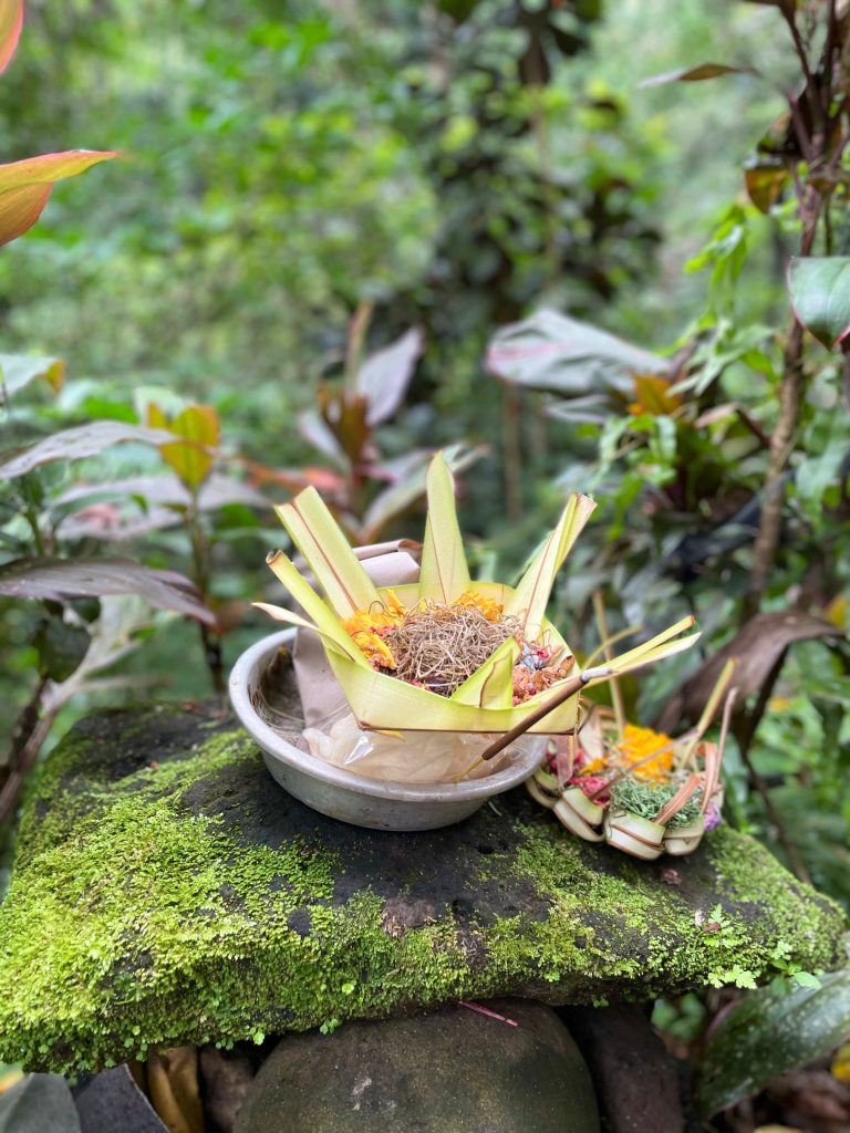 Religion is very important and affects every aspect of life of Balinese people. They make offerings, sesajen, to spirits several times a day. These spirits are believed to maintain peace and balance on earth. The offerings that are often found in front of the house or on the roadside are called “canang sari”. Canang sari has the smallest size among all the offerings. It is made of coconut leaf shaped in form of rectangular container and shaft containing betel nut, areca nut and lime representing Brahma, Vishnu and Mahesh. It also contains sliced sugar cane, bananas and fragrant flowers. Flowers must be fresh and fragrant as a symbol of sincerity and purity.