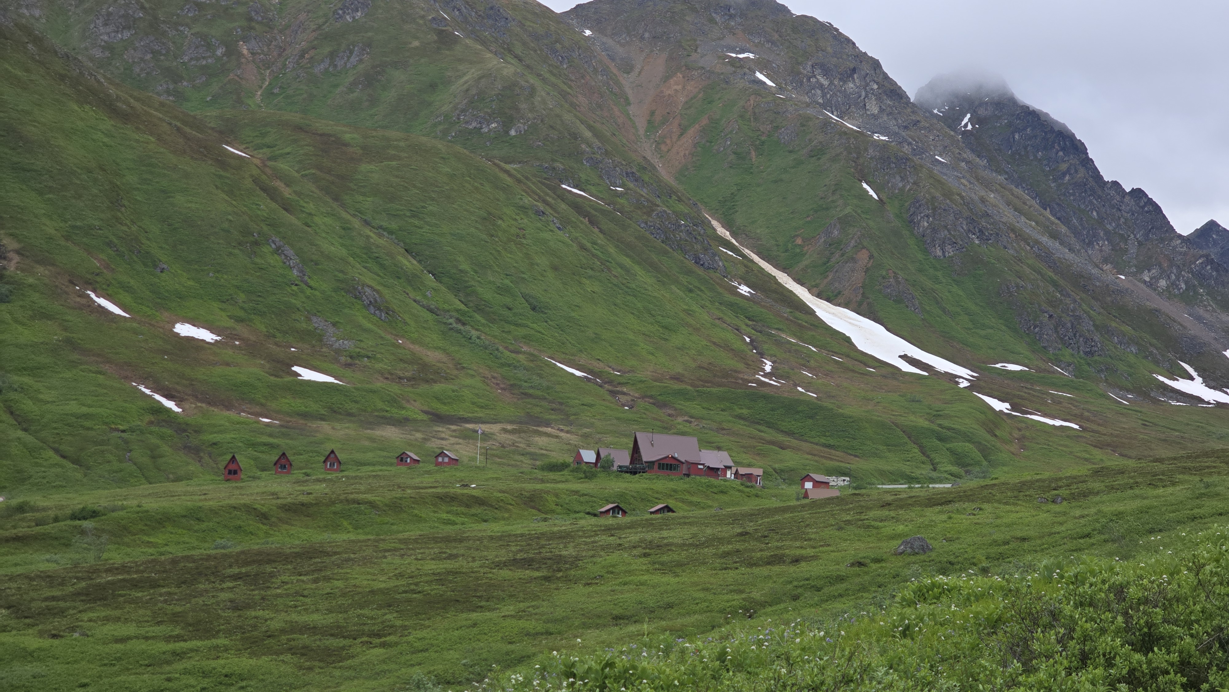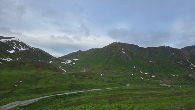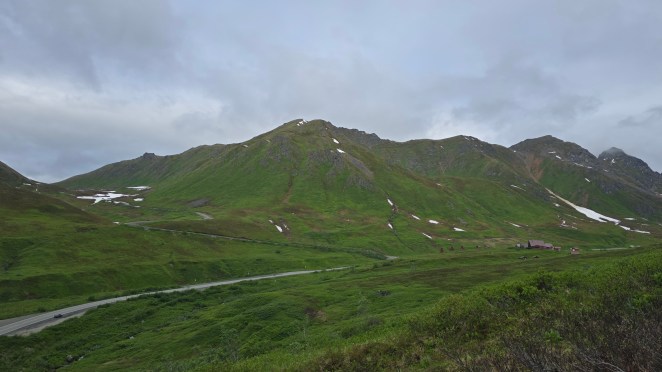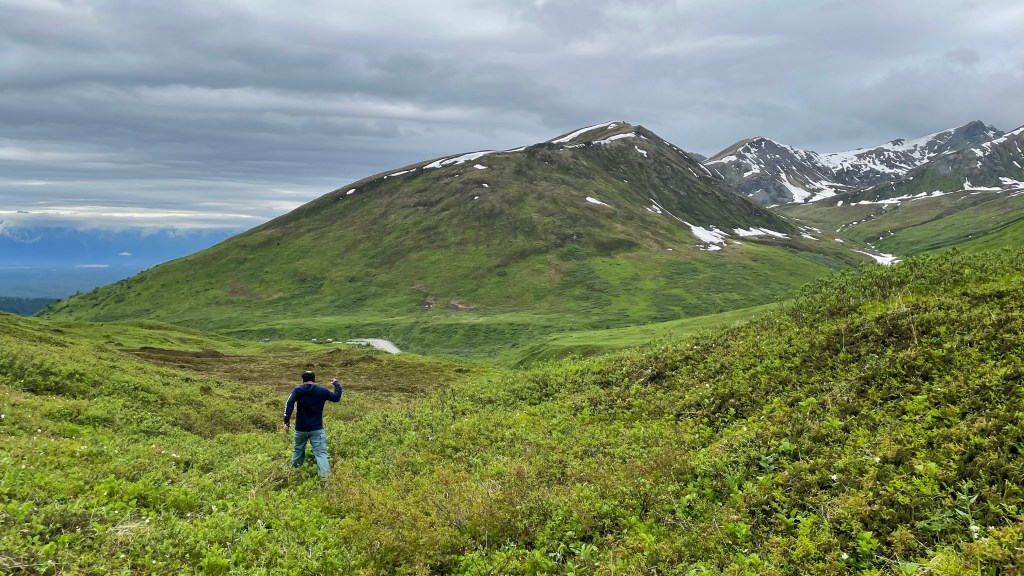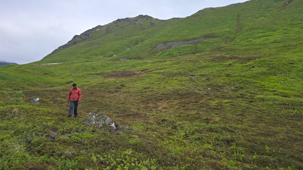 The higher we climbed, the more Hatcher’s Pass unfolded into a breathtaking panorama. Green rolling meadows stretched endlessly, dotted with the iconic red wooden cabins that have become the signature of this valley. These bright huts stood out like lanterns in a sea of alpine green. Occasional patches of snow clung to the slopes, remnants of winter hanging on stubbornly in shaded corners. The whole scene reminded me of Bedni Bugyal from my Roopkund trek in the Himalayas—those same undulating meadows that made you feel like you were walking through a living painting.