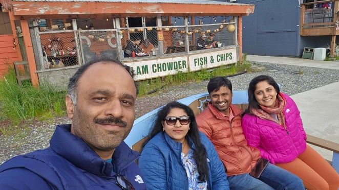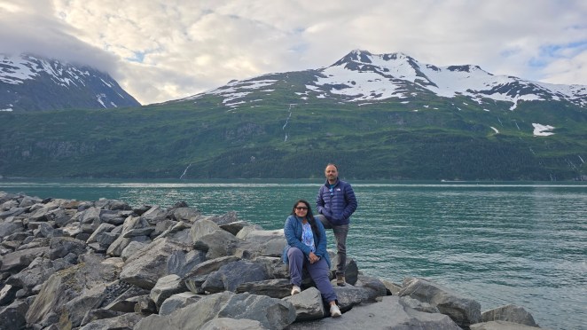Knowing this was our final night in Alaska, we drove to the Portage Lake viewpoint, a quiet open space with glacier-fed water shimmering under the pale evening sky. There was no phone signal here—just mountains, silence, and us. Initially, the stillness felt eerie. But as time passed, it became soothing. The sky dimmed but never went fully dark—just a deep, glowing twilight, the kind only Alaskan summers can conjure.