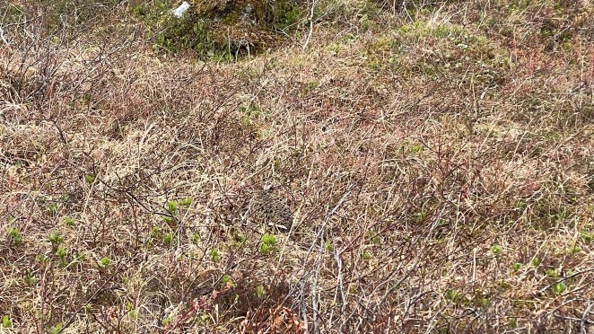 The slope was gentle at first. The ground under us was covered in thick mosses creating a soft, velvety cushion. Every step felt springy, as if walking on nature’s own mattress. We spotted a bird—so perfectly camouflaged in the low shrubs that it took us a moment to see it move. This was the Willow Ptarmigan, Alaska’s state bird. In summer, its feathers are mottled brown and speckled, blending seamlessly with the tundra. But in winter, it undergoes one of the Arctic’s most remarkable transformations: its entire plumage turns snowy white, a perfect camouflage against endless winter snowfields.