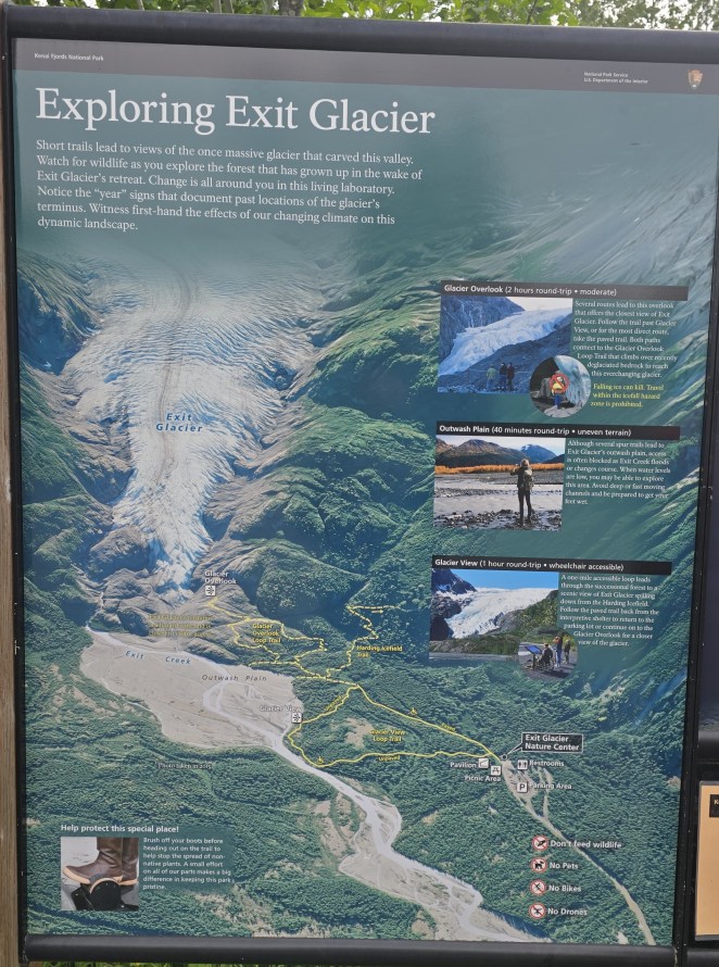 We chose the second, a moderate two-hour round-trip hike to Exit Glacier. The trail begins along a wide outwash plain, created by meltwater streams that carry silt from beneath the glacier. Exit Creek rushes through the middle, carrying tiny particles of ground rock—“glacial flour”—that shimmer in the water. As we walked, wooden signs marked different years: 1899, 1926, 1978, 2005. Each sign showed where the glacier’s edge once stood. With every step, we weren’t just moving uphill; we were moving forward in time, witnessing how far the ice has retreated.