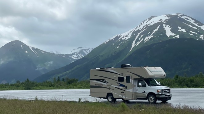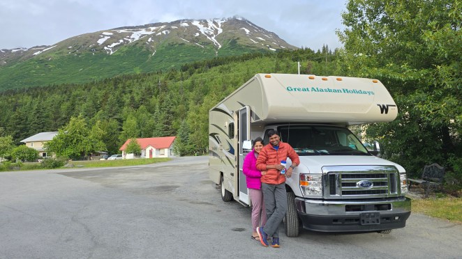 As we rejoined the Seward Highway, the road curved along the iconic Turnagain Arm, one of Alaska’s most spectacular coastlines. We were hungry by now. So, we had a simple breakfast of cereals in a Walmart parking lot in Anchorage, a very RV-life moment.