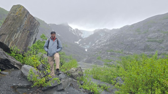Lush green mountains, cascading with snowmelt and a lone RV standing against this backdrop looked stunning. The contrast between the vibrant vegetation and the icy blue of the glacier created a scene so surreal that we couldn’t stop clicking photos.
