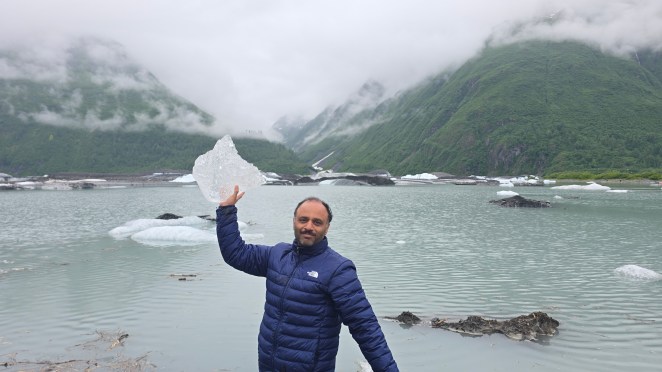 From the viewpoint, the scale of the glacier was breathtaking. A small telescope allowed us to examine its intricate crevasses and the deep U-shaped valley it had carved over millennia. It’s fascinating how glaciers sculpt the land differently from rivers — while rivers cut V-shaped valleys, glaciers carve broad, sweeping U-shaped troughs. In many cases, glacial valleys that dip below sea level eventually fill with seawater, forming the majestic fjords Alaska is famous for.